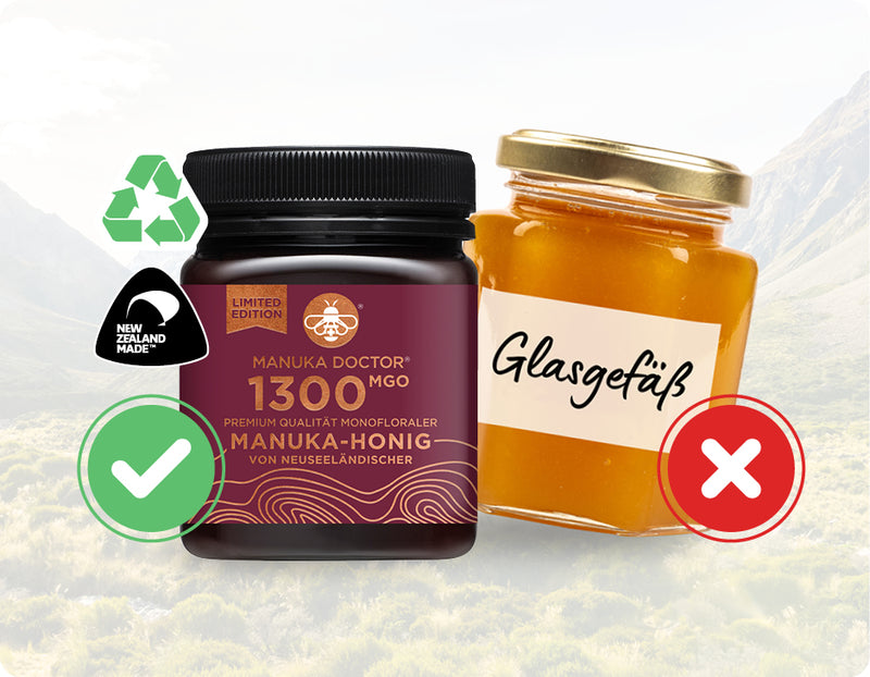 Daher sind Marken die ihren Manuka in Europa in günstige Gläser abfüllen, um dann horrende Preise dafür zu verlangen mit Vorsicht zu genießen.